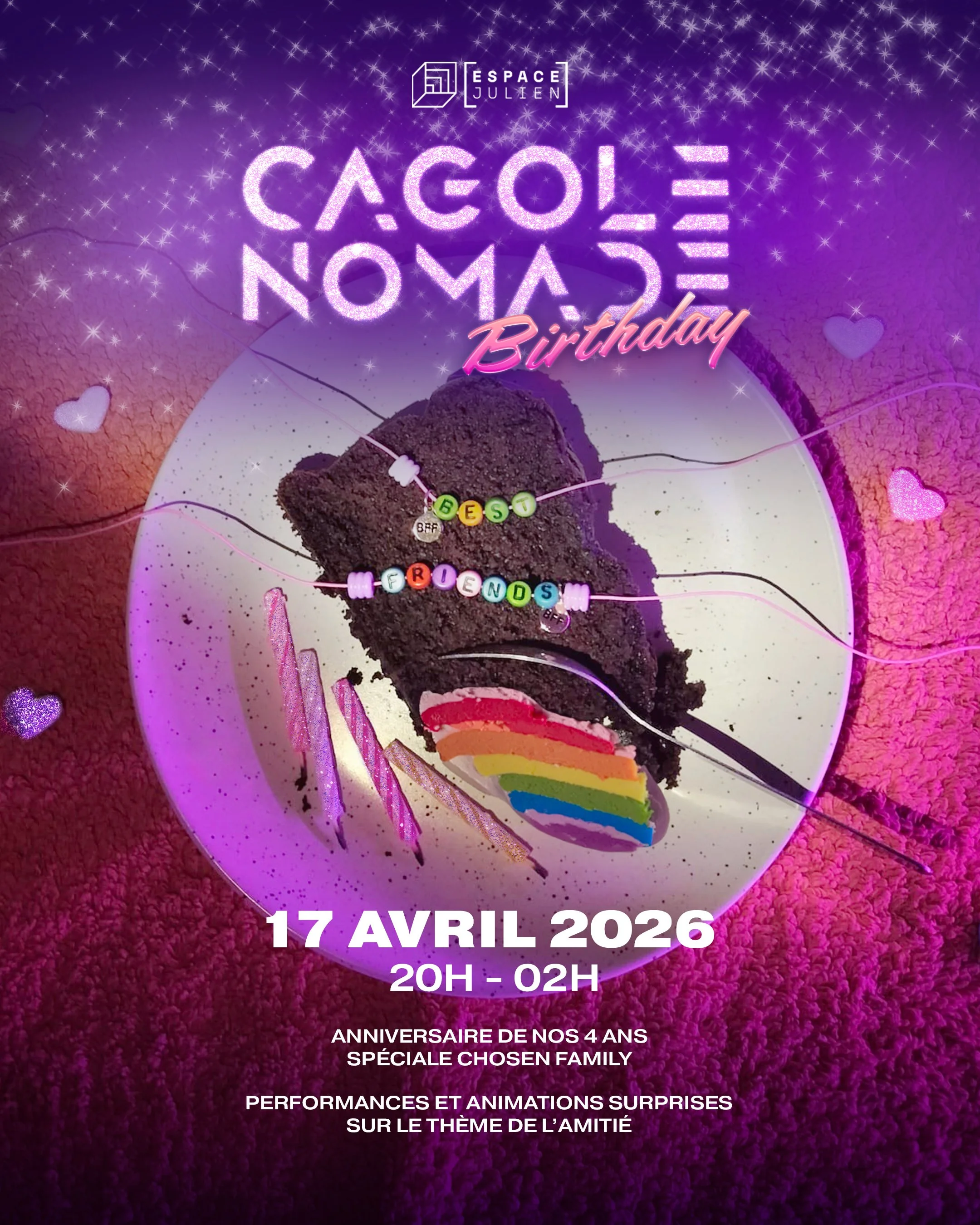 Le 17 avril, on célèbre les 4 ans de CAGOLE NOMADE et surtout ce qui nous unit : nos familles choisies ! Celles qui brillent la nuit et tiennent chaud quand tout tangue. Pour l’occasion, on t’a préparé une soirée pleine d’amour, de feu et de surprises ! ✨ Au programme ✨: